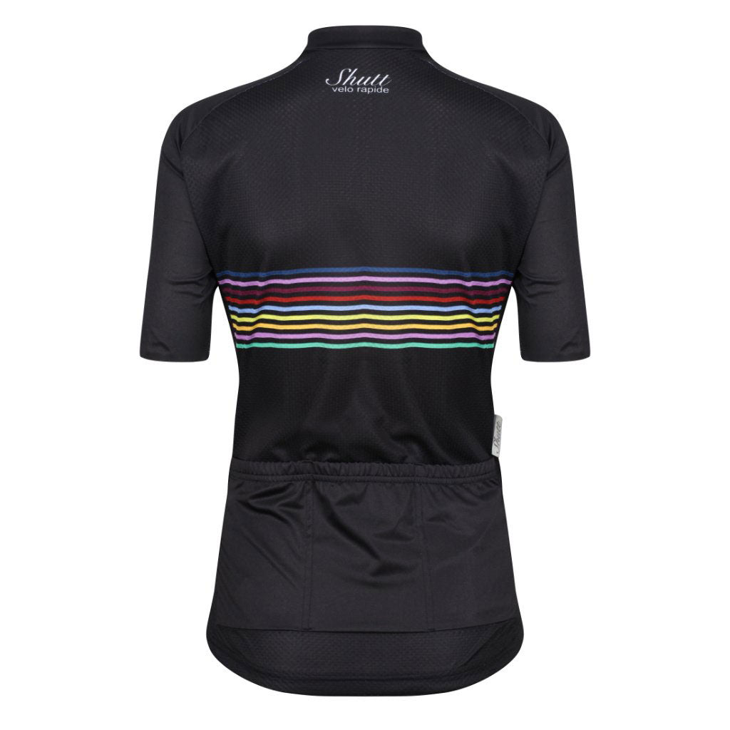 Feauturing the rainbow Shutt band across the chest in a new style, this jersey is perfect for a long ride on a sunny day.